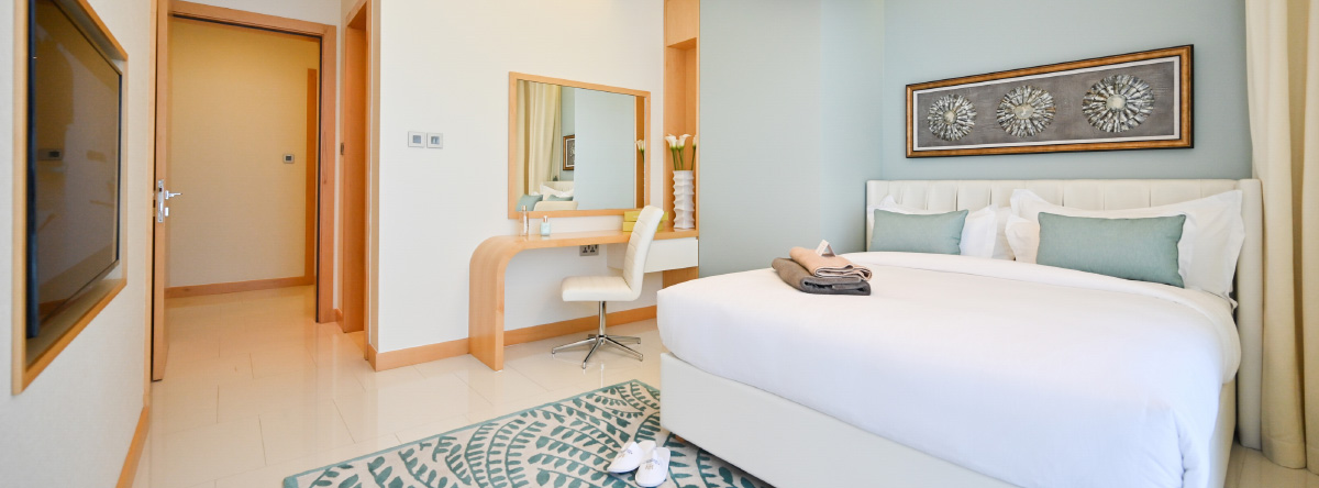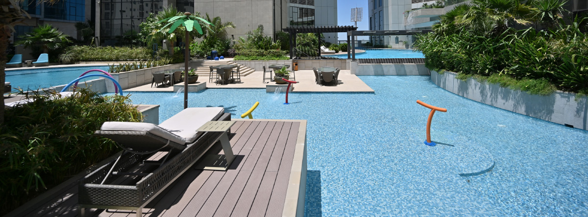 Also, the apartment features outstanding 5-star resort shared amenities. These include a signature spa and health club, sauna and steam room, and indoor pool; plus a fully-equipped gym and martial arts studio. There is also a large outdoor swimming pool with a sun deck and a jogging track. Children can enjoy a waterpark, crazy golf course and special play areas and marvel at the remarkable service.