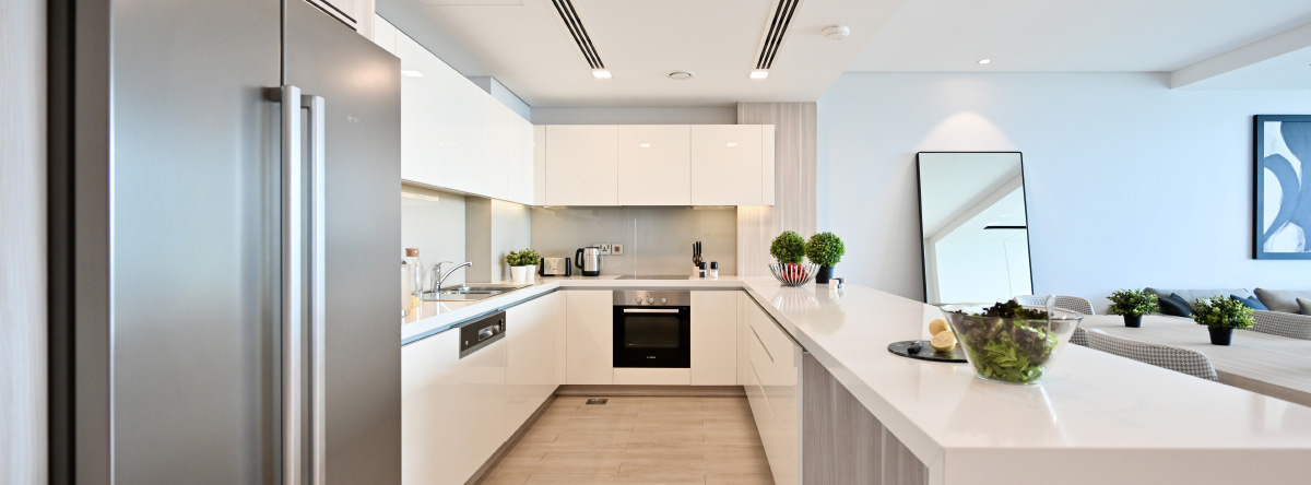 The 3 BR apartment has an open kitchen