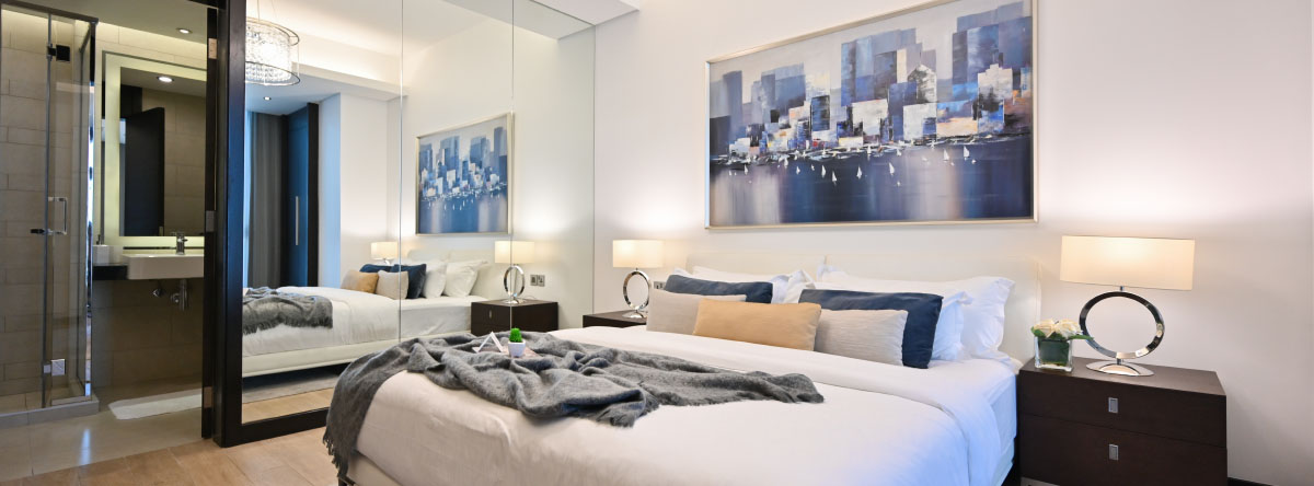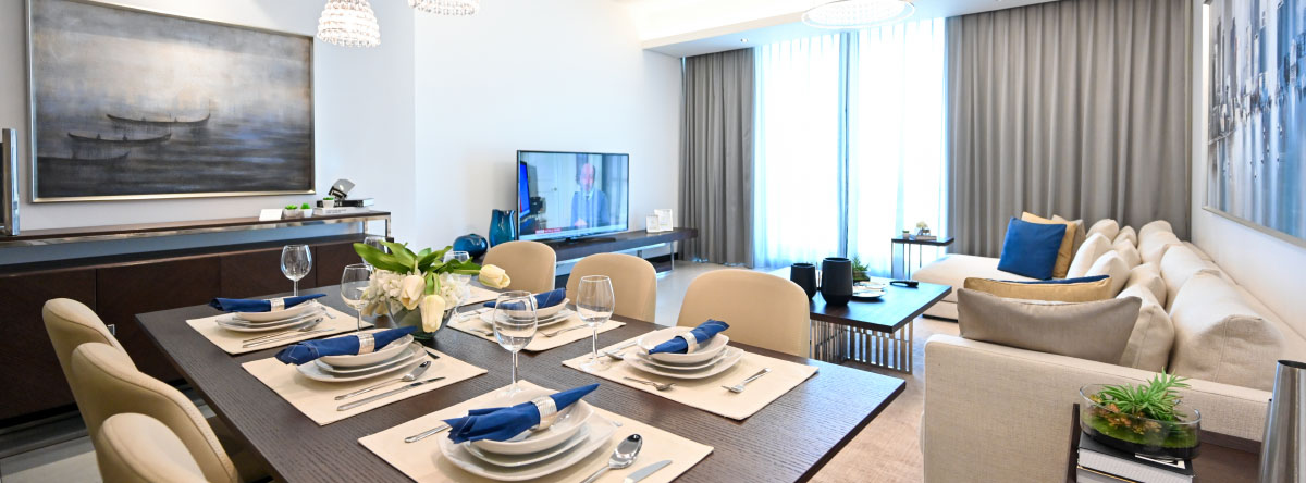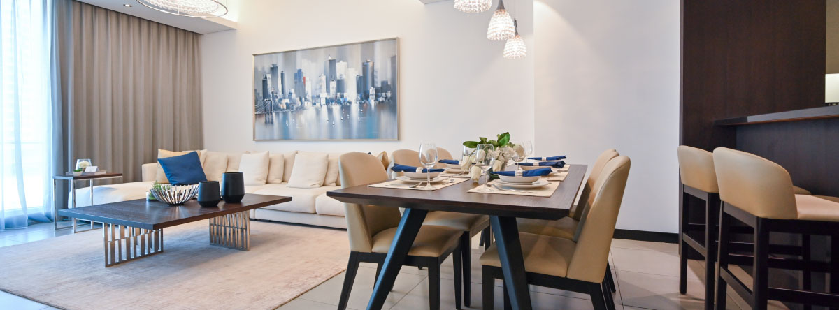 الشقة بغرفتي نوم تحتوي على مطبخ شبه مفتوح