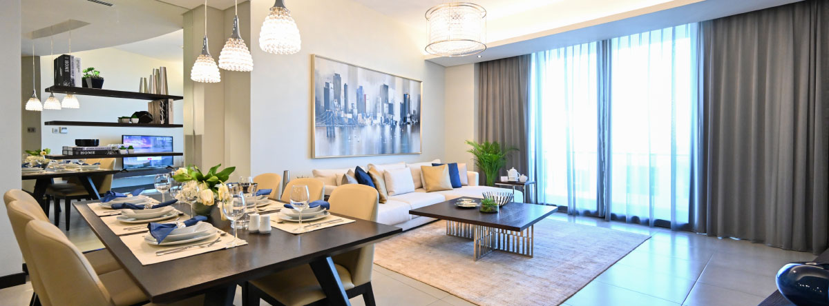 الشقة بغرفتي نوم تحتوي على مطبخ شبه مفتوح