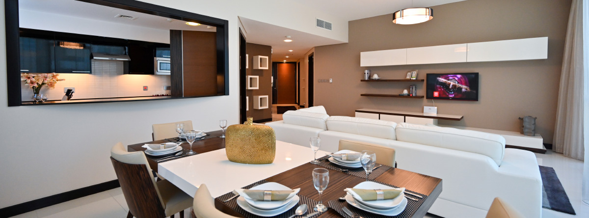 الشقة بغرفتي نوم تحتوي على مطبخ مفتوح