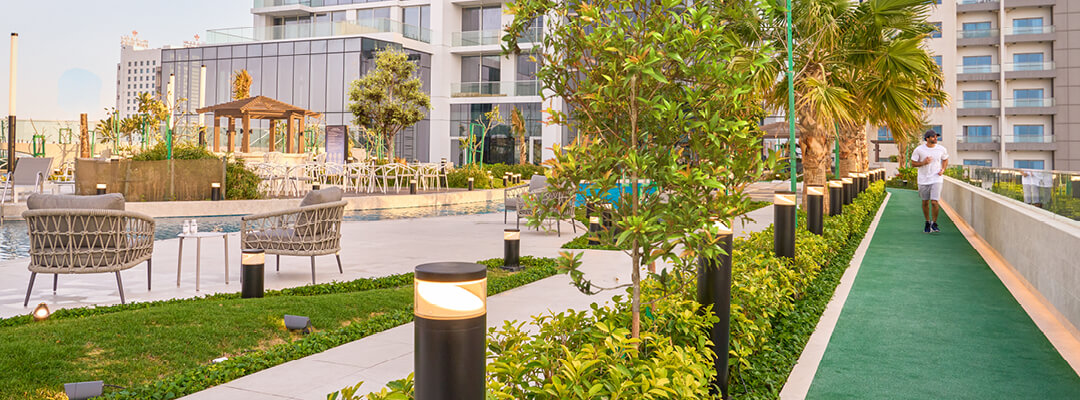 تشمل المرافق الحصرية في الهواء الطلق واحة استوائية هي الأولى من نوعها مع نباتات أصلية ومتنزه مائي للأطفال ومضمار للركض ومسبح ونهر وشاطئ اصطناعي. يوجد في الداخل صالة رياضية واستوديو للياقة البدنية ومنتجع صحي ومسبح داخلي ومنطقة ألعاب ومنطقة لعب للأطفال وقاعة ترفيه ونادي ومركز أعمال.
